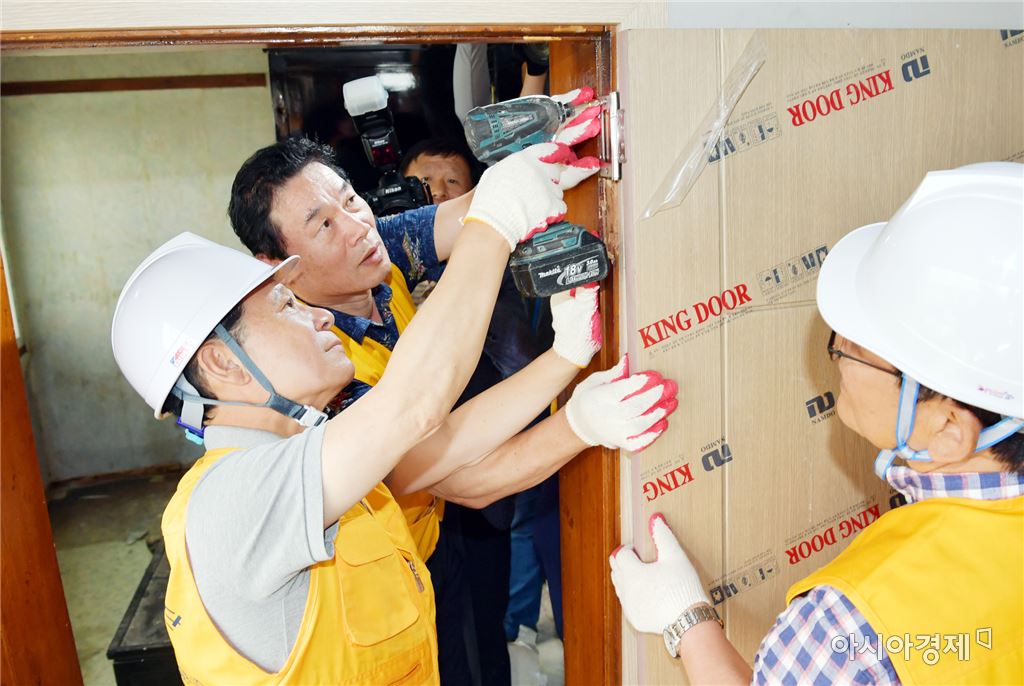 윤장현 광주광역시장이 ‘행복한 목수 봉사단’의 낡은 주택 수리작업에 함께 해 땀을 흘렸다. 사진제공=광주시