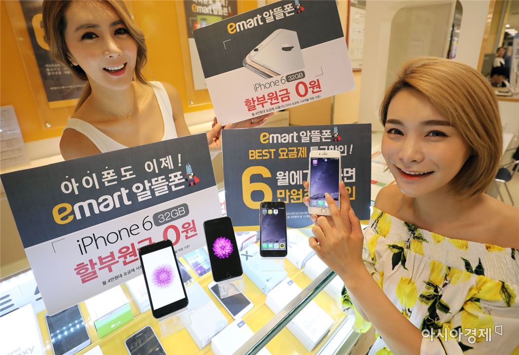 이마트는 6일부터 전국 66개 알뜰폰 매장에서 아이폰 6 32GB 스페이스 그레이 색상을 판매한다. 판매가는 월 4만원대(LTE59) 요금제 사용 시 0원, 월 3만원대(LTE39) 요금제 사용 시 19만원이다. 타사 대비 15만원 이상 저렴한 가격이다.<ⓒ세계를 보는 창 경제를 보는 눈, 아시아경제(www.asiae.co.kr) 무단전재 배포금지>