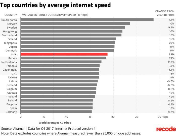 아카마이가 발표한 2017년도 1분기 전 세계 인터넷 평균 속도 현황(사진=리코드)