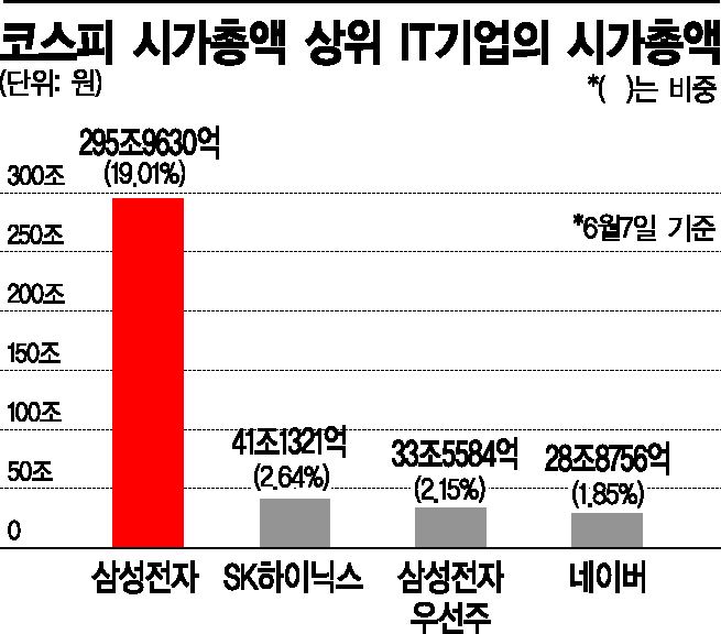 코스피가 IT기술주 중심의 시장으로 변모한 것은 국내 IT산업이 독보적으로 발전한 데 기인한다. 한국거래소 금융시장분석팀 관계자는 "코스피는 한국의 펀더멘탈을 반영하는 거울상으로 볼 수 있다"며 "전체 산업과 펀더멘털을 그대로 벤치마킹하다 보니 코스피도 IT산업쪽으로 기울게 된 것"이라고 설명했다. 거래소에 따르면 코스피 시가총액 5위 내 4개사(삼성전자, SK하이닉스, 삼성전자 우선주, 네이버)가 IT섹터주이다. 이들 4개 기업의 시총(7일 기준)은 각각 삼성전자 295조9630억원, SK하이닉스 41조1321억원, 삼성전자 우선주 33조5584억원, 네이버 28조8756억원으로 합하면 코스피 전체 시총의 1/4을 넘어선다. 코스피가 IT업종 중심으로 움직이자 거래소는 한국을 대표할 수 있는 종목을 따로 모아 지수를 개발하기도 했다. 거래소 관계자는 "코스피가 IT업종을 주로 반영하므로 코스피와 코스닥시장 내 우량주를 따로 모아 'KTOP30'을 개발하기도 했다"고 말했다. 박나영 기자 bohena@asiae.co.kr<ⓒ세계를 보는 창 경제를 보는 눈, 아시아경제(www.asiae.co.kr) 무단전재 배포금지>