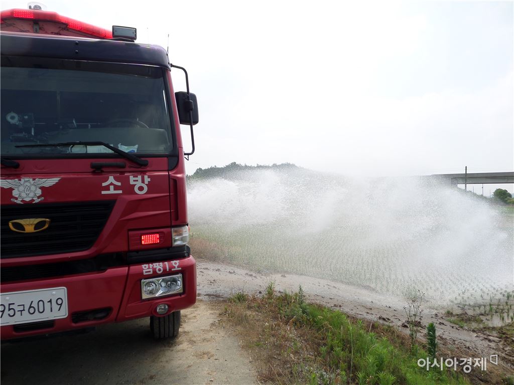 [아시아경제 노해섭 ]함평군 함평읍(읍장 이광우)이 8일 영광소방서 함평119안전센터의 지원을 받아 수호리의 한 논에 물을 대고 있다. 이곳은 모내기는 끝났지만 가뭄에 논바닥이 타들어가 농민도 애가 탔다. 소방차에서 시원하게 쏟아지는 물줄기에 작물도 모처럼 생기를 되찾았다. 이광우 읍장은 “가뭄으로 마음고생하는 농민의 시름을 덜기 위해 심혈을 기울이고 있다”고 밝혔다.노해섭 기자 nogary@<ⓒ세계를 보는 창 경제를 보는 눈, 아시아경제(www.asiae.co.kr) 무단전재 배포금지>