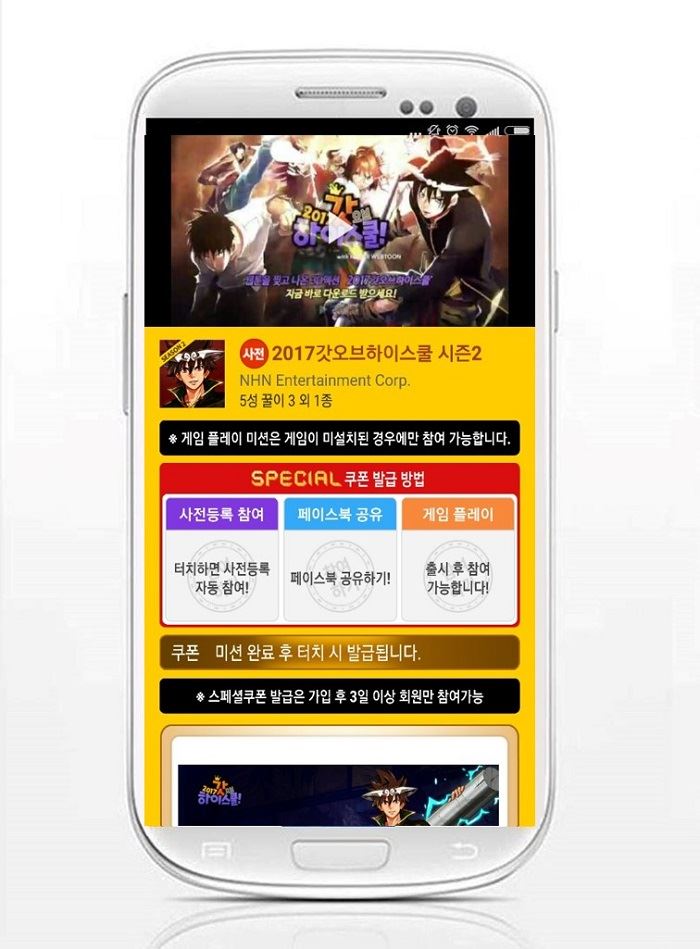 이번에 쿠폰이 추가된 게임은 시즌2 업데이트를 앞두고 있는 ‘2017 갓 오브 하이스쿨 with 네이버웹툰(이하 2017갓오하)’으로 사전예약 신청만해도 ‘루비 100개’, ‘50만 골드’, ‘에너지 1,000개’, ‘6성 꿀이’를 제공한다. 아울러 ‘페이스북 공유하기’, ‘업데이트 후 게임 플레이’ 미션을 완료하면 ‘10만 골드’, ‘5성 꿀이 3개’를 추가로 지급한다.NHN엔터테인먼트가 서비스하는 ‘2017 갓오하’는 네이버 인기 웹툰 ‘갓 오브 하이스쿨’을 원작으로 한 모바일 액션 RPG다. 풀 3D로 구현된 진모리, 한대위, 우마왕 등 인기 캐릭터를 수집해 게임을 즐길 수 있으며, GOH 영웅대전, 3:3 팀대전, 룬의 사원, 무한녹스전, 도전의 탑 등 다채로운 콘텐츠를 자랑한다.‘2017 갓오하’는 6월 중 시즌2 업데이트를 실시할 예정이다. 시즌2 업데이트에는 외형은 물론 능력치, 스킬 등 모든 것이 업그레이드 되는 ‘각성 영웅’과 신규 전투 콘텐츠 ‘열쇠 대전’, 신규 모험 ‘챕터5 천상대전’, ‘펫 시스템’ 등이 포함되어 있다.한편, ‘모비’는 ‘노블레스 with 네이버웹툰’, ‘아제라: 아이언하트', ‘뮤오리진’, ‘펜타스톰 for Kakao’, ‘캐리비안의 해적: 전쟁의 물결’, ‘파이널 블레이드’ 등 인기 게임의 무료 쿠폰과 ‘파이널 판타지XV: 새로운 제국’, ‘탱고파이브’, ‘리니지M’, ‘솔리더스’ 등 모바일게임 기대작의 사전예약 쿠폰을 포함해 사전예약 어플 중 가장 많은 게임 쿠폰을 제공하며 회원 수, 일일 유저 수에서 독보적인 1위를 달리고 있다.디지털뉴스본부 온라인이슈팀 issue@asiae.co.kr<ⓒ세계를 보는 창 경제를 보는 눈, 아시아경제(www.asiae.co.kr) 무단전재 배포금지>