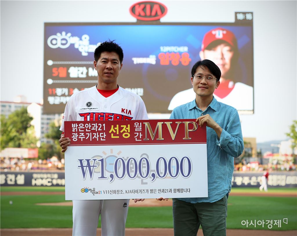 [아시아경제 노해섭 기자]KIA타이거즈 투수 임창용이 구단 지정병원인 밝은안과21병원이 시상하는 5월 월간 MVP에 선정돼 9일 광주 넥센전에 앞서 시상식을 가졌다.임창용은 5월 6경기에 구원 투수로 등판해 11이닝 동안 16개의 탈삼진을 곁들이며 3승(1패) 4세이브를 올리는 등 빼어난 투구를 선보였다. 이날 시상은 밝은안과21병원 나성진 원장이 했고, 시상금은 100만원이다.임창용은 시상금 중 50만원을 불우이웃돕기 성금으로 기부했다.노해섭 기자 nogary@<ⓒ세계를 보는 창 경제를 보는 눈, 아시아경제(www.asiae.co.kr) 무단전재 배포금지>