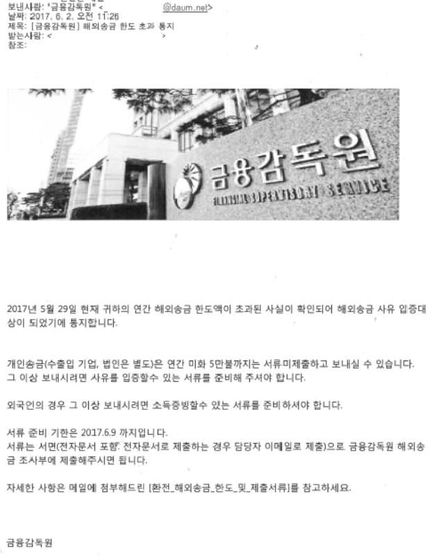 [아시아경제 정현진 기자] 해외 송금을 할 때 연간 한도액을 넘어섰다며 소득증빙 서류를 제출하라는 가짜 이메일 피싱이 기승을 부리고 있어 금융당국이 주의를 요구했다.11일 금융감독원은 지난달 31일부터 이달 7일까지 '불법사금융피해 신고센터에 금감원을 사칭해 '해외송금 한도 초과 통지'라는 이메일을 받았다는 신고가 19건 집중 접수 됐다고 밝혔다.연간 해외송금 한도액이 넘었으니 이에 대한 입증을 위해 소득증빙 서류 등을 제출하라는 거짓 내용을 이메일로 보내는 것이다.이들은 이메일과 함께 '해외송금 한도 및 제출서류'라는 한글파일을 첨부해서 보냈다.금감원은 사전에 확인되지 않은 이메일을 개인에게 발송하지 않는다며 메일을 열람하게끔 하거나 첨부파일 실행, 웹주소 링크 클릭 등을 유도해 악성코드에 감염시켜 개인정보를 탈취하는 사례가 많다고 설명했다. 이에 메일에 첨부파일이 있을 경우 반드시 발송자에게 유선으로 사전 확인한 뒤 파일을 확인하라고 강조했다.또 이메일을 받은 경우 발송자 주소나 발송인을 꼼꼼히 확인하고 출처가 불분명한 경우 이메일을 열람하지 말고 첨부파일도 실행하지 않고 즉시 메일을 삭제하라고 금감원은 경고했다.만약 이같은 우편이나 이메일을 받을 경우 금감원 '불법사금융피해 신고센터(1332)'로 신고하고 악성코드 감염이 의심되는 경우에는 한국인터넷진흥원 보호나라 홈페이지 또는 118상담센터로 신고하라고 강조했다.정현진 기자 jhj48@asiae.co.kr<ⓒ세계를 보는 창 경제를 보는 눈, 아시아경제(www.asiae.co.kr) 무단전재 배포금지>