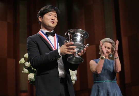 10일(현지시간) 미국 포트워스에서 반 클라이번 국제 피아노 콩쿠르 우승컵을 받아든 선우예권(왼쪽). 사진=반 클라이번 콩쿠르