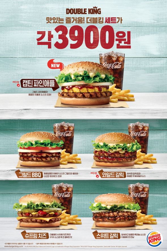 [아시아경제 이선애 기자]버거킹이 더블킹의 새로운 메뉴로 ‘캡틴 파인애플’을 12일 출시했다. 캡틴 파인애플(단품 2900원·세트 3900원)은 두툼하고 부드러운 패티에 그릴드 파인애플을 더하고, 할라피뇨를 훈연 건조해 만든 매콤한 치폴레 소스를 더해 맛의 조화를 이룬 것이 특징이다. 엄격한 검수 과정을 거친 양상추, 양파 등 신선한 야채를 더해 더욱 풍성한 맛을 완성했다. 버거킹에서 판매하는 더블킹(단품 2900원·세트 3900원) 제품은 젊은 소비자들이 부담 없는 가격에 푸짐하게 즐길 수 있도록 제공하는 메뉴다. 세트메뉴를 주문하면 콜라와 버거킹만의 두툼한 프렌치프라이까지 3900원에 즐길 수 있는 합리적인 구성으로 소비자에게 많은 사랑을 받고 있다. 또한 기존의 ‘그릴드 BBQ’ ‘와일드 갈릭’ ‘슈프림 치즈’ ‘스위트 갈릭’에 이어 캡틴 파인애플이 다섯 번째 더블킹 메뉴로 출시됨에 따라 입맛에 따른 소비자 선택의 폭도 넓어졌다.이선애 기자 lsa@asiae.co.kr<ⓒ세계를 보는 창 경제를 보는 눈, 아시아경제(www.asiae.co.kr) 무단전재 배포금지>