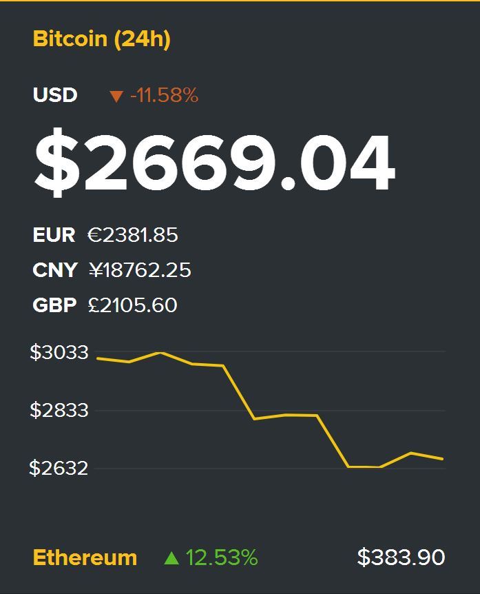 코인데스크에 따르면 비트코인은 지난 11일(현지시간) 1비트코인당 미화 3000달러를 넘어섰으나 하루만에 2000달러선으로 내려갔다. (코인데스크)