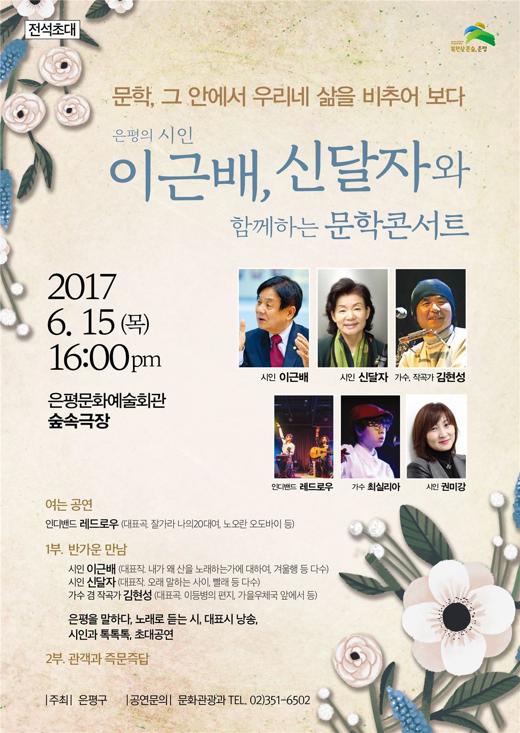 또 이번 행사 중간에는 두 시인의 작품을 노래로 표현한 ‘노래로 듣는 시’가 진행돼 시 낭독과는 또 다른 감동을 관객들에게 전할 예정이다. 뿐 아니라 '이등병의 편지' '가을우체국 앞에서' 등 다양한 곡을 작곡한 가수 겸 작곡가인 김현성씨 공연과 인디밴드 레드로우 등 흥겨운 무대가 연출돼 관객들의 마음을 사로잡을 예정이다. 김우영 구청장은 “은평 뿐 아니라 구민들이 원하는 다양한 문인들을 모시고 구민들과 소통하는 자리를 지속적으로 마련, 구민들이 문학 향유의 즐거움을 누릴 수 있도록 노력하겠다"며 "앞으로도 지속 될 은평의 문학 진흥 프로젝트에 많은 관심을 당부한다“고 말했다.토크콘서트는 문학에 관심있는 사람이면 누구나 사전 예약없이 무료로 관람할 수 있다. 은평구 문화관광과(☎351-6502)로 문의하면 된다. 박종일 기자 dream@asiae.co.kr<ⓒ세계를 보는 창 경제를 보는 눈, 아시아경제(www.asiae.co.kr) 무단전재 배포금지>