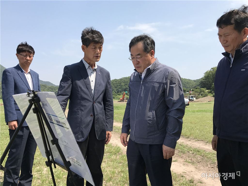 정승 농어촌공사 사장(오른쪽 두번째)은 13일 충북 청주 가뭄현장을 방문하고 수자원 확보 현황을 점검했다.