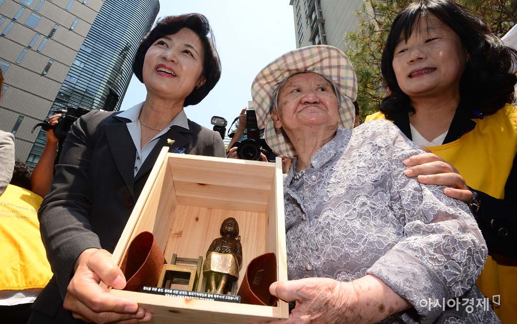 [아시아경제 백소아 기자] 14일 서울 종로구 평화의 소녀상 앞에서 열린 제1287차 일본군 위안부 문제 해결을 위한 정기 수요시위에서 길원옥 할머니(오른쪽)가 추미애 더불어민주당 대표(왼쪽)에게 평화의 소녀상 인형을 전달하고 있다.백소아 기자 sharp2046@asiae.co.kr<ⓒ세계를 보는 창 경제를 보는 눈, 아시아경제(www.asiae.co.kr) 무단전재 배포금지>