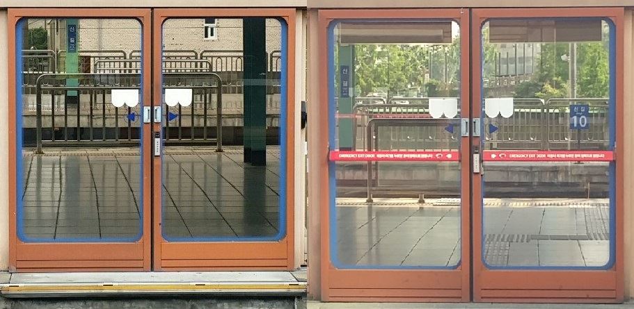 코레일은 현재 역사(驛舍)에 설치돼 있는 스크린도어에 안전바(BAR)를 추가 도입해 설치함으로써 스크린도어 안전사고 제로화에 도전한다. 사진은 안전바 설치 전(좌측)과 후(우측) 모습. 코레일 제공
