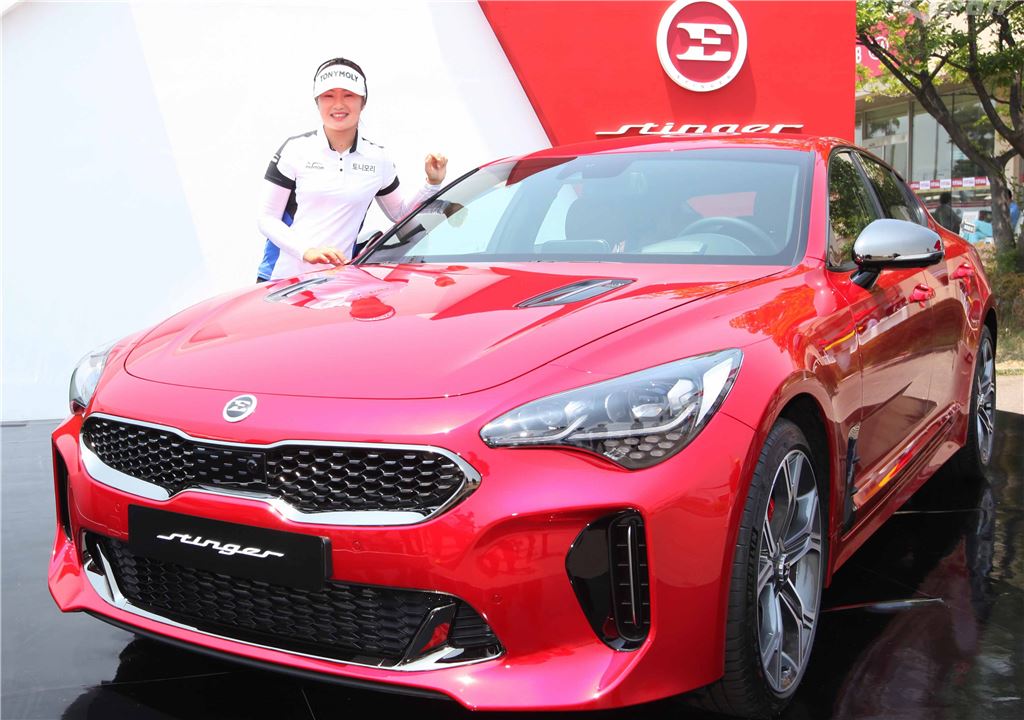 이정은6가 한국여자오픈 첫날 3연속버디로 기아자동차의 고급 세단 스팅어를 부상으로 받은 뒤 환하게 웃고 있다. 사진=KLPGA