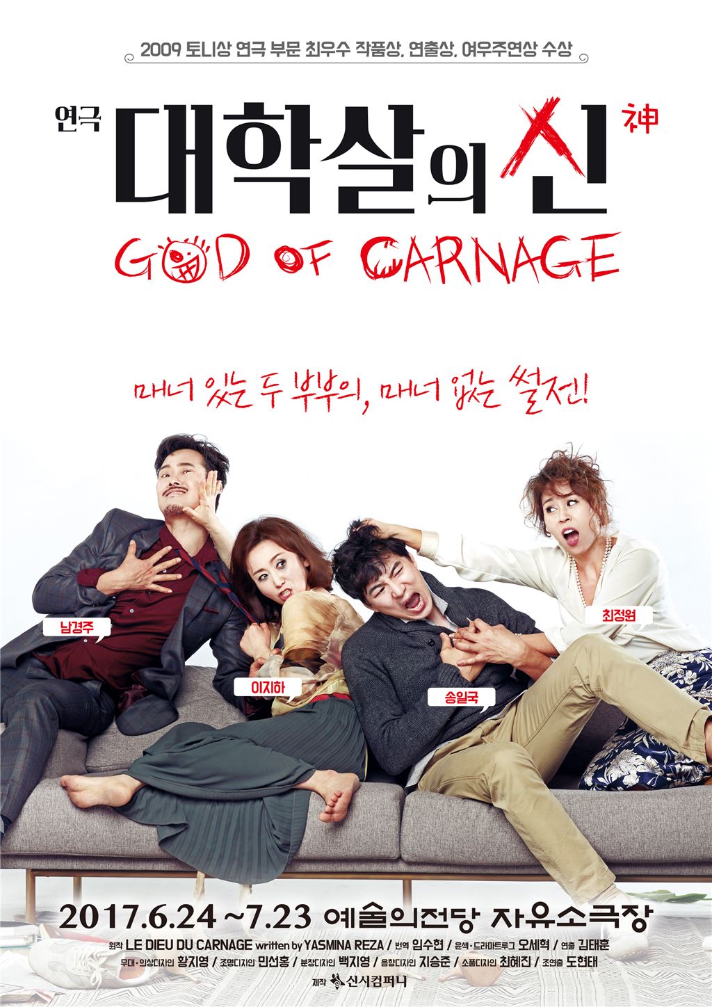 [아시아경제 장인서 기자] 연극 '대학살의 신(연출 김태훈)'이 오는 24일부터 7월23일까지 서울 예술의전당 자유소극장 무대에 오른다.'대학살의 신'은 프랑스 작가 야스미나 레자의 작품으로, 2009년 토니상과 올리비에상을 받았다. 국내에서는 2010년 초연됐고 2011년 앙코르 공연 이후 6년 만에 관객과 만난다.작품은 놀이터에서 벌어진 11살 두 소년의 싸움이 부모들의 싸움으로 번지는 모습을 통해 인간이 가진 위선과 허위의식을 꼬집는다. 고상하고 예의 바르게 시작한 어른들의 대화는 유치찬란한 설전으로 변하고 결국 진흙탕 싸움으로 치닫는다.뮤지컬 배우 남경주와 최정원, 배우 송일국과 이지하가 각각 부부로 출연한다.장인서 기자 en1302@asiae.co.kr<ⓒ세계를 보는 창 경제를 보는 눈, 아시아경제(www.asiae.co.kr) 무단전재 배포금지>