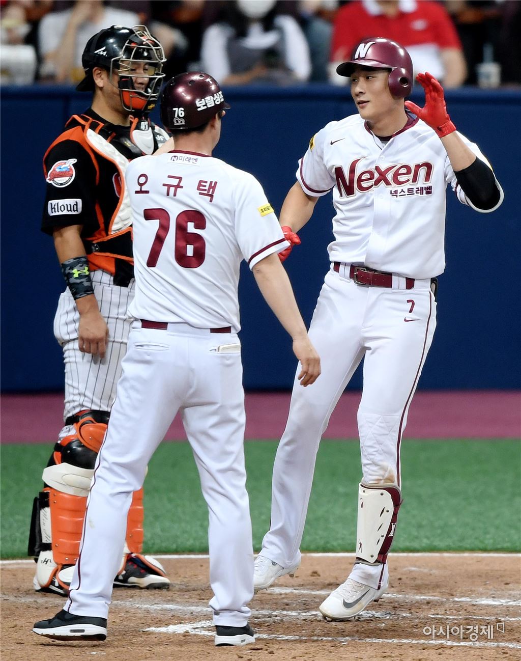 [아시아경제 김현민 기자]프로야구 롯데 자이언츠와 넥센 히어로즈의 2017 KBO리그 경기가 17일 서울 고척돔에서 열렸다. 3회말 무사 만루에서 넥센 김하성이 롯데 선발 박시영을 상대로 만루 홈런을 치고 오규택 코치와 기뻐하고 있다. 김현민 기자 kimhyun81@asiae.co.kr<ⓒ세계를 보는 창 경제를 보는 눈, 아시아경제(www.asiae.co.kr) 무단전재 배포금지>
