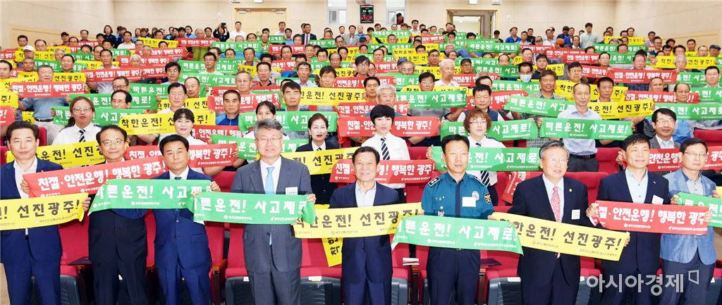 [아시아경제 노해섭 기자]윤장현 광주광역시장(앞줄 가운데)이 19일 오후 광주교통문화연수원 대강당에서 광주지역 교통 관련 기관· 단체와 사업용 운전자 등이 참여한 가운데 열린 ‘교통사고 감축 및 친절도 향상을 위한 사업용 운전자 결의대회’에서 김회재 광주지방검찰청 검사장, 이기창 광주지방경찰청장, 이정재 광주선진교통문화범시민운동본부 대표 등 참석자들과 교통사고 줄이기를 다짐하고 있다./광주광역시 제공<ⓒ세계를 보는 창 경제를 보는 눈, 아시아경제(www.asiae.co.kr) 무단전재 배포금지>
