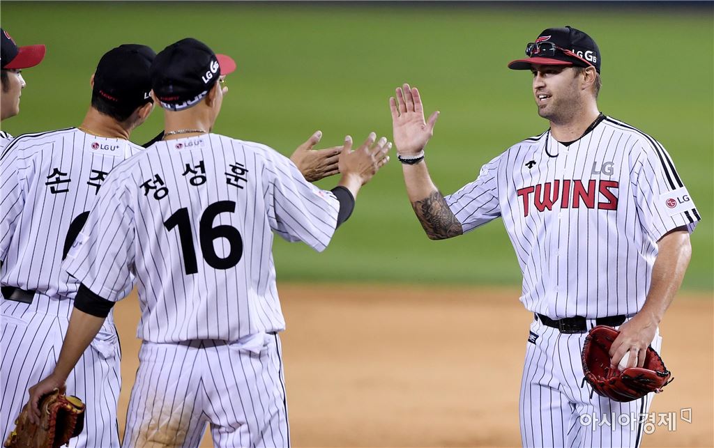 [아시아경제 김현민 기자]프로야구 삼성 라이온스와 LG 트윈스의 2017 KBO리그 경기가 20일 잠실구장에서 열렸다. LG 선발투수 허프가 5-3 승리를 확정한 뒤 동료들과 기뻐하고 있다. 김현민 기자 kimhyun81@asiae.co.kr<ⓒ세계를 보는 창 경제를 보는 눈, 아시아경제(www.asiae.co.kr) 무단전재 배포금지>