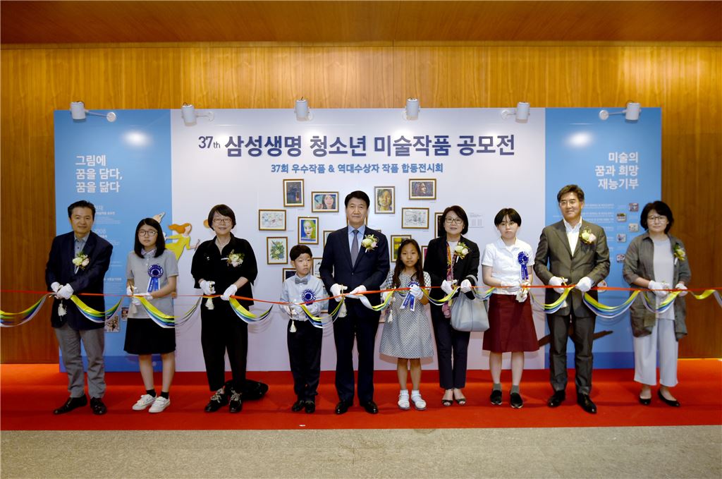 20일 서초구 소재 삼성금융캠퍼스에서 진행된 청소년 미술작품 공모전 시상식에서 김창수 삼성생명 사장(가운데)과 수상자, 후원미대학장 등이 합동전시회 기념 테이프를 자르고 있다. 사진제공 삼성생명<br /> <br />