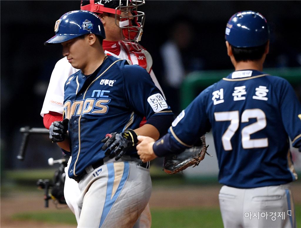 [인천=아시아경제 김현민 기자]프로야구 NC 다이노스와 SK와이번스의 2017 KBO리그 경기가 21일 인천 SK행복드림구장에서 열렸다. 7회초 2사에서 NC 나성범이 SK 김태훈을 상대로 추가 솔로 홈런을 치고 전준호 코치와 하이파이브하고 있다.김현민 기자 kimhyun81@asiae.co.kr<ⓒ세계를 보는 창 경제를 보는 눈, 아시아경제(www.asiae.co.kr) 무단전재 배포금지>