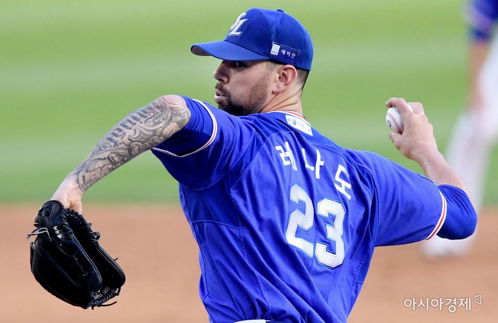 [아시아경제 김현민 기자]프로야구 삼성 라이온즈와 LG 트윈스의 2017 KBO리그 경기가 22일 잠실구장에서 열렸다. 삼성 선발투수 레나도가 역투하고 있다. 김현민 기자 kimhyun81@asiae.co.kr<ⓒ세계를 보는 창 경제를 보는 눈, 아시아경제(www.asiae.co.kr) 무단전재 배포금지>