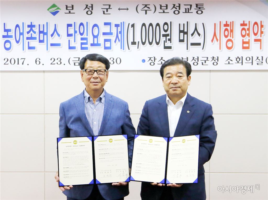 보성군(군수 이용부. 오른쪽)은 7월 1일부터 천원버스 본격 시행을 위해 ㈜보성교통(대표 박재순)과 23일 군 소회의실에서 운송협약을 체결했다.<br />