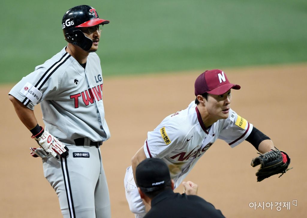 [아시아경제 김현민 기자]프로야구 LG 트윈스와 넥센 히어로즈의 2017 KBO리그 경기가 23일 서울 고척돔에서 열렸다. 6회초 무사 1,3루에서 넥센 유격수 김하성이 LG 양석환의 3루 땅볼 때 협살에 걸린 박용택과 이천웅을 태그아웃 시키고 있다. 김현민 기자 kimhyun81@asiae.co.kr<ⓒ세계를 보는 창 경제를 보는 눈, 아시아경제(www.asiae.co.kr) 무단전재 배포금지>