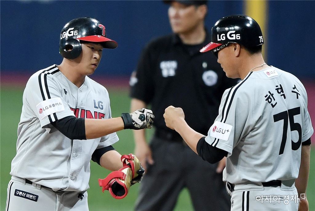[아시아경제 김현민 기자]프로야구 LG 트윈스와 넥센 히어로즈의 2017 KBO리그 경기가 23일 서울 고척돔에서 열렸다. 9회초 2사 3루에서 LG 대타 안익훈이 1타점 적시타를 치고 한혁수 코치와 하이파이브하고 있다. 김현민 기자 kimhyun81@asiae.co.kr<ⓒ세계를 보는 창 경제를 보는 눈, 아시아경제(www.asiae.co.kr) 무단전재 배포금지>