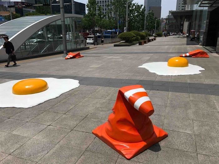 여름철 극심한 무더위로 유명한 대구에서 이를 역발상 아이디어로 활용한 이색 조형물들이 설치돼 화제다. 지난 22일, 대구 중구의 한 백화점 앞에는 익어버린 대형 계란 프라이 여러 점과 녹아버린 러버콘(교통차단봉)을 형상화한 조형물들이 곳곳에 설치됐다.이는 우리나라에서 가장 무더운 대구의 이미지를 실감나게 표현한 것으로, 실제 조형물 하단에는 대구와 아프리카의 합성어인 ‘대프리카(Daefrica)'가 영어로 표기돼있다.페이스북 캡쳐