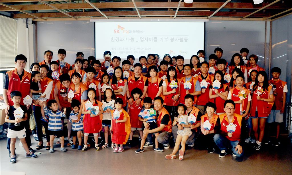 ▲ 지난 24일 SK건설 임직원 가족이 서울 은평구 서울혁신파크에서 업사이클링(Upcycling) 가족봉사 활동을 실시 후 단체 기념촬영을 하고 있다.