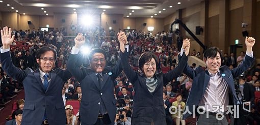 [아시아경제 윤동주 기자] 26일 국회에서 열린 바른정당 당 대표 및 최고위원 지명대회에서 신임 당 대표로 선출된 이혜훈 후보와 김영우, 정운천, 하태경 신임 최고위원이 손을 맞잡고 손을 번쩍 들고 있다.윤동주 기자 doso7@asiae.co.kr<ⓒ세계를 보는 창 경제를 보는 눈, 아시아경제(www.asiae.co.kr) 무단전재 배포금지>