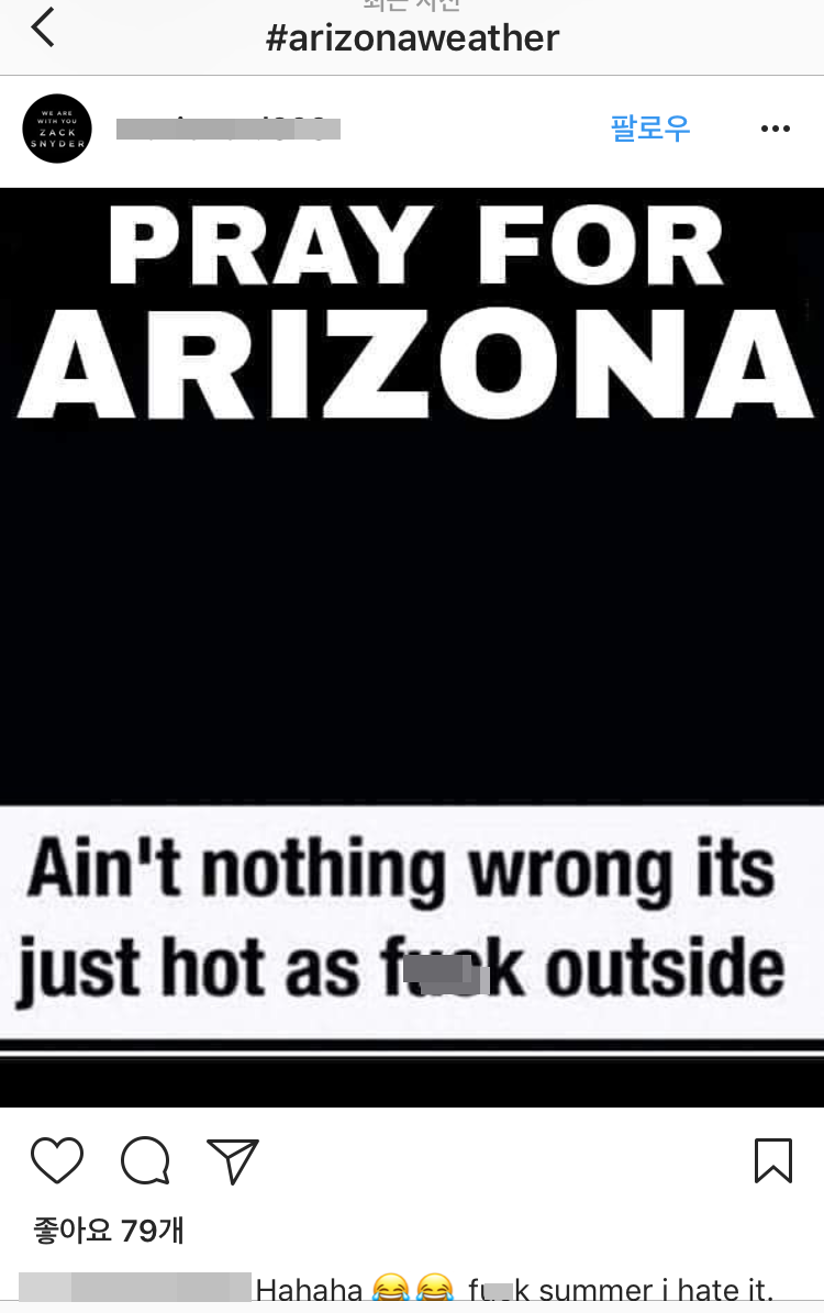 상단에 '애리조나를 위해 기도해 달라'는 말이 적혀있다. 하단에는 '잘못된 건 없어. 그냥 매우 더울뿐' 이라는 문구가 적혀있다. /사진=인스타그램 캡쳐