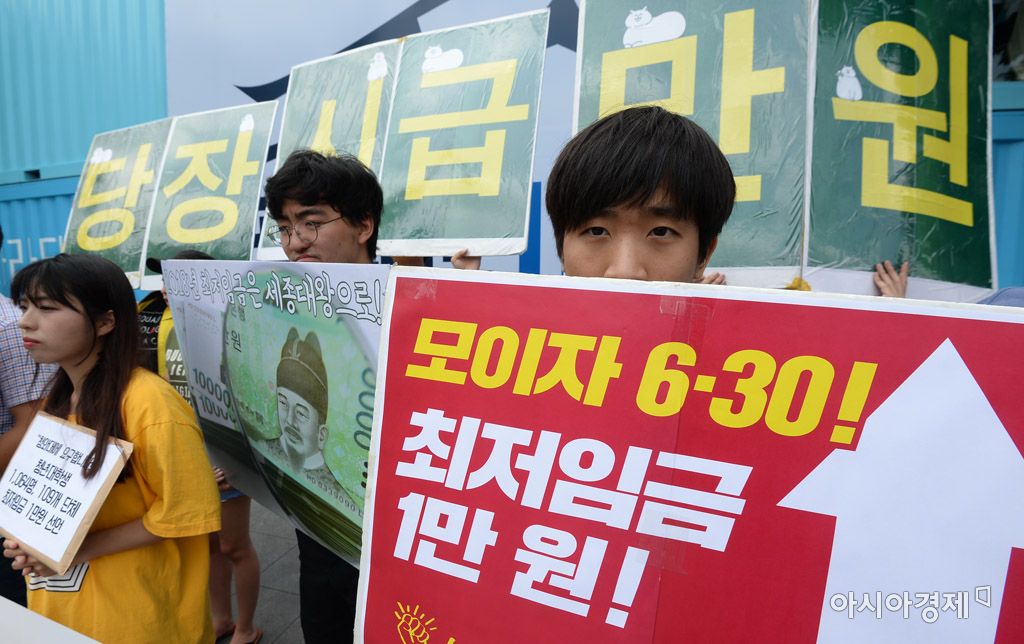 [아시아경제 문호남 수습기자] 최저임금 만원 공동행동을 비롯한 청년·대학생들이 27일 서울 종로구 광화문 1번가 앞에서 열린 최저임금 1만원 선언 기자회견에서 손팻말을 들고 있다.문호남 수습기자 munonam@asiae.co.kr<ⓒ세계를 보는 창 경제를 보는 눈, 아시아경제(www.asiae.co.kr) 무단전재 배포금지>