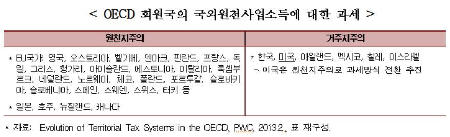 한경연은 이에 따라 우리나라도 원천지주의 과세체계로 전환해야 한다고 주장했다. 미국마저 원천지주의를 선택한다면 자본의 국내유입 감소와 국외 유출을 유도해 나아가 세수입까지 감소할 수 있다는 우려 때문이다. 임 부연구위원은 "원천지주의 과세방식은 해외유보소득의 봉쇄효과를 해소해 국내로의 자금 유입을 유인한다"며 "본사 소재지로서의 추가 세부담이 없어 다국적기업 유치를 위한 조세경쟁력도 높이는 효과가 있다"고 주장했다. 실제로 뉴질랜드의 경우 1988년 거주지주의 과세체계로 전환했다가 국가경쟁력 상실을 이유로 2009년 다시 원천지주의 과세로 전환했다. 그 결과 제도 전환 이후 5년간 뉴질랜드의 국내총생산(GDP) 대비 해외직접투자액 평균 비율은 제도 도입 이전 5년에 비해 56.4% 증가했다. 임 부연구위원은 "중장기적으로도 우리나라 경제에 유리한 제도를 선택한다면 당장 우리나라 기업에게 세금을 많이 걷는 거주지주의 과세보다 우리나라를 세계 기업의 활동무대로 만들어 장기적이고 지속적인 세금을 부과할 수 있는 원천지주의 과세가 더 적합하다"고 말했다.한편 트럼프는 세제개혁안을 통해 법인세율을 현행 35%에서 15%로 인하한다고 발표했다. 현재 누진세율 체계(15%~35%)로 돼 있는 법인세율을 15%로 단일화해 모든 기업에 적용한다는 방침이다. 이에 대해 한경연은 "OECD 회원국 중 가장 높은 법인세율을 유지해온 미국도 OECD 회원국 대부분이 국제 조세경쟁력 확보를 위해 법인세를 인하하고 있다"며 "자국 기업과 일자리의 해외 유출을 막고 성장률을 높이기 위해 법인세 인하 조치를 발표한 것"이라고 말했다. 김혜민 기자 hmeeng@asiae.co.kr<ⓒ세계를 보는 창 경제를 보는 눈, 아시아경제(www.asiae.co.kr) 무단전재 배포금지>