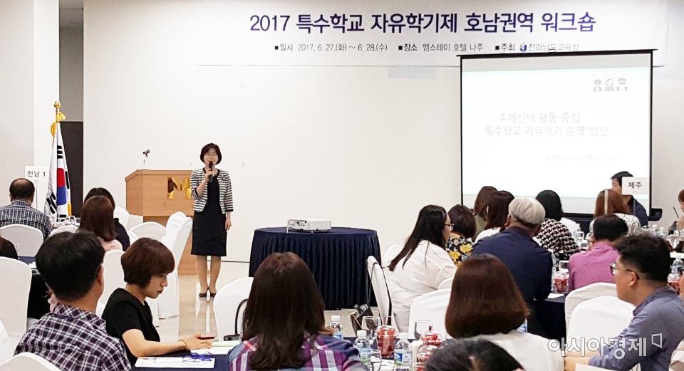 "특수학교 자유학기제! 장애학생 꿈, 끼 키운다"[아시아경제 노해섭 기자]전남도교육청(교육감 장만채)은 27~28일 나주 엠스테이호텔에서 호남권(광주·전북·전남·제주) 시·도교육청과 특수학교 업무 담당자 등 80명을 대상으로 특수학교 자유학기제 호남권역 워크숍을 갖는다.이번 워크숍은 호남권역 선도교육청인 전남교육청이 주관했으며, 2018년 특수학교 자유학기제 전면 시행에 대비해 학교 여건과 장애특성, 장애정도를 반영한 운영 방안을 모색하고 담당자 역량 강화와 정보 공유를 위해 마련됐다.특수학교 자유학기제는 지난 2016년 시범 운영을 시작으로 2018년에는 모든 특수학교에 전면 시행된다.이는 다양한 학생 중심의 경험을 제공해 장애학생들이 꿈과 끼를 찾고 적극적 참여와 성취 경험을 통해 모두가 만족하는 행복 특수교육 실현을 위함이다.첫날 나사렛대학교 유장순 교수의 ‘자유학기 운영 방안’특강을 시작으로 일반학교 및 각 시·도교육청 운영사례 발표와 교육부의 특수학교 자유학기제 지원에 대한 설명이 있었다.이어 둘째날에는 정책연구학교인 나주이화학교를 방문해 현장의 운영 현황을 살펴본다.이용덕 교육진흥과장은 “다양한 사례 공유와 운영학교 방문 등을 통해 자유학기제 운영의 내실화를 도모하는 계기가 되길 바란다”며 “장애학생들이 꿈과 끼를 찾을 수 있는 진로역량 강화에 큰 도움을 줄 것으로 기대한다”고 말했다.한편, 도교육청은 2017년 교육부 특별교부금 국가시책사업으로 특수학교 자유학기제 주제선택 활동 교수·학습 자료를 개발, 전국 특수학교에 보급해 다양한 자유학기 활동을 지원할 계획이다.노해섭 기자 nogary@<ⓒ세계를 보는 창 경제를 보는 눈, 아시아경제(www.asiae.co.kr) 무단전재 배포금지>