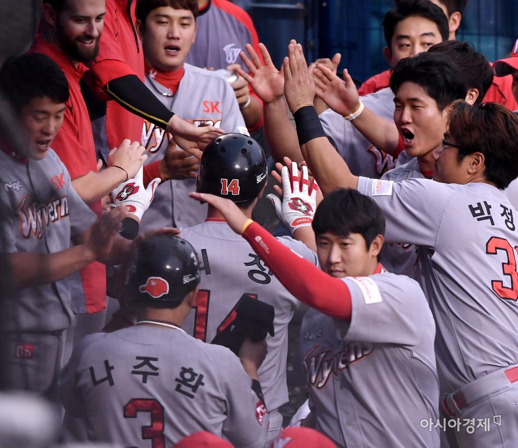 [아시아경제 김현민 기자]프로야구 SK 와이번스와 두산 베어스의 2017 KBO리그 경기가 27일 잠실구장에서 열렸다. 3회초 2사 1,3루에서 SK 최정이 두산 선발 니퍼트를 상대로 선제 스리런 홈런을 치고 동료들과 기뻐하고 있다. 김현민 기자 kimhyun81@asiae.co.kr<ⓒ세계를 보는 창 경제를 보는 눈, 아시아경제(www.asiae.co.kr) 무단전재 배포금지>