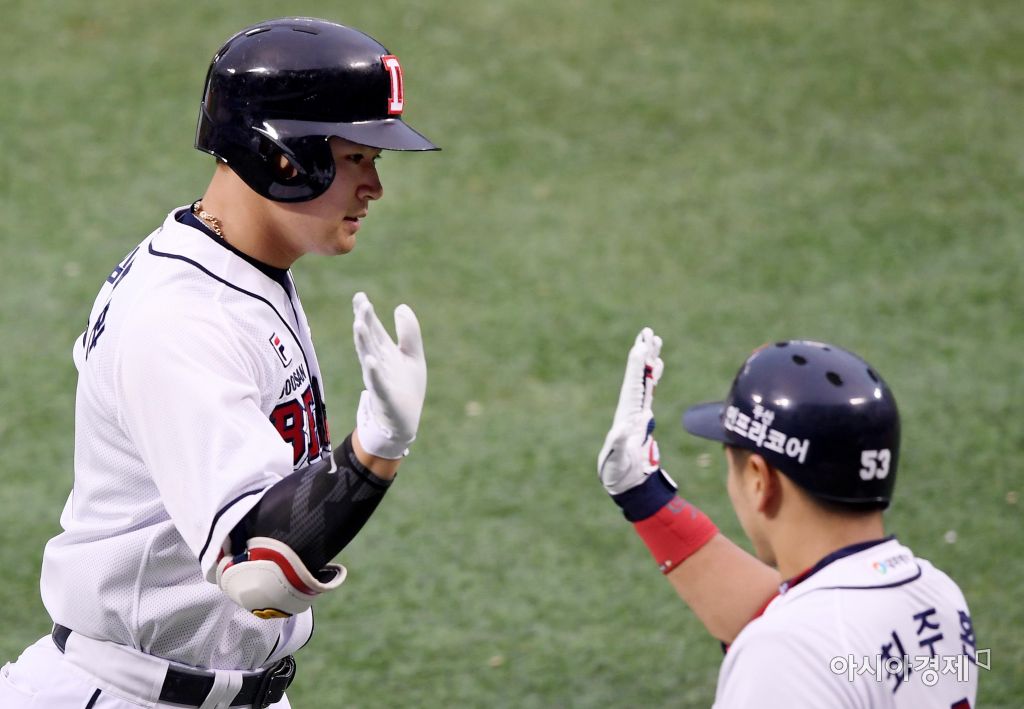 [아시아경제 김현민 기자]프로야구 SK 와이번스와 두산 베어스의 2017 KBO리그 경기가 27일 잠실구장에서 열렸다. 3회말 1사에서 두산 김재환이 SK 선발 박종훈을 상대로 좌월 솔로 홈런을 치고 대기타석의 최주환과 하이파이브하고 있다. 김현민 기자 kimhyun81@asiae.co.kr<ⓒ세계를 보는 창 경제를 보는 눈, 아시아경제(www.asiae.co.kr) 무단전재 배포금지>