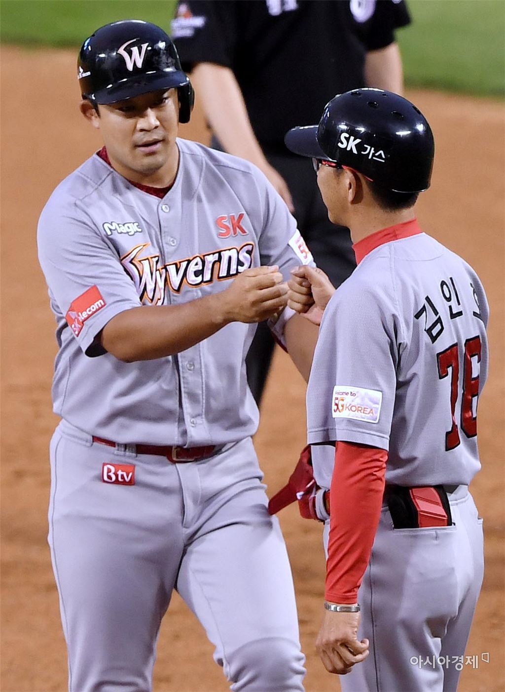 [아시아경제 김현민 기자]프로야구 SK 와이번스와 두산 베어스의 2017 KBO리그 경기가 27일 잠실구장에서 열렸다. 4회초 1사에서 SK 정의윤이 좌전 안타를 치고 김인호 코치와 하이파이브하고 있다. 김현민 기자 kimhyun81@asiae.co.kr<ⓒ세계를 보는 창 경제를 보는 눈, 아시아경제(www.asiae.co.kr) 무단전재 배포금지>