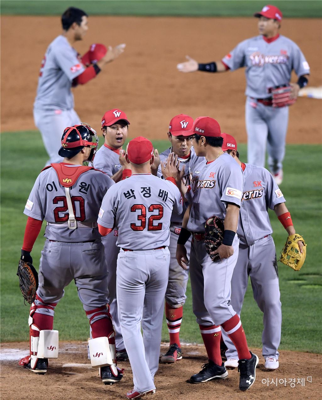 [아시아경제 김현민 기자]프로야구 SK 와이번스와 두산 베어스의 2017 KBO리그 경기가 27일 잠실구장에서 열렸다. SK 선수들이 5-1 승리를 확정한 뒤 기뻐하고 있다. 김현민 기자 kimhyun81@asiae.co.kr<ⓒ세계를 보는 창 경제를 보는 눈, 아시아경제(www.asiae.co.kr) 무단전재 배포금지>