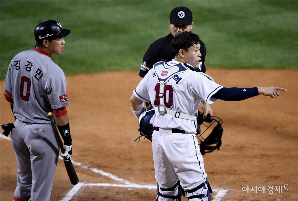 [아시아경제 김현민 기자]프로야구 SK 와이번스와 두산 베어스의 2017 KBO리그 경기가 28일 잠실구장에서 열렸다. 8회초 1사 3루에서 두산 김강률의 폭투 때 박세혁 포수와 SK 타석의 김강률이 사구와 볼을 각각 피력하고 있다. 김현민 기자 kimhyun81@asiae.co.kr<ⓒ세계를 보는 창 경제를 보는 눈, 아시아경제(www.asiae.co.kr) 무단전재 배포금지>