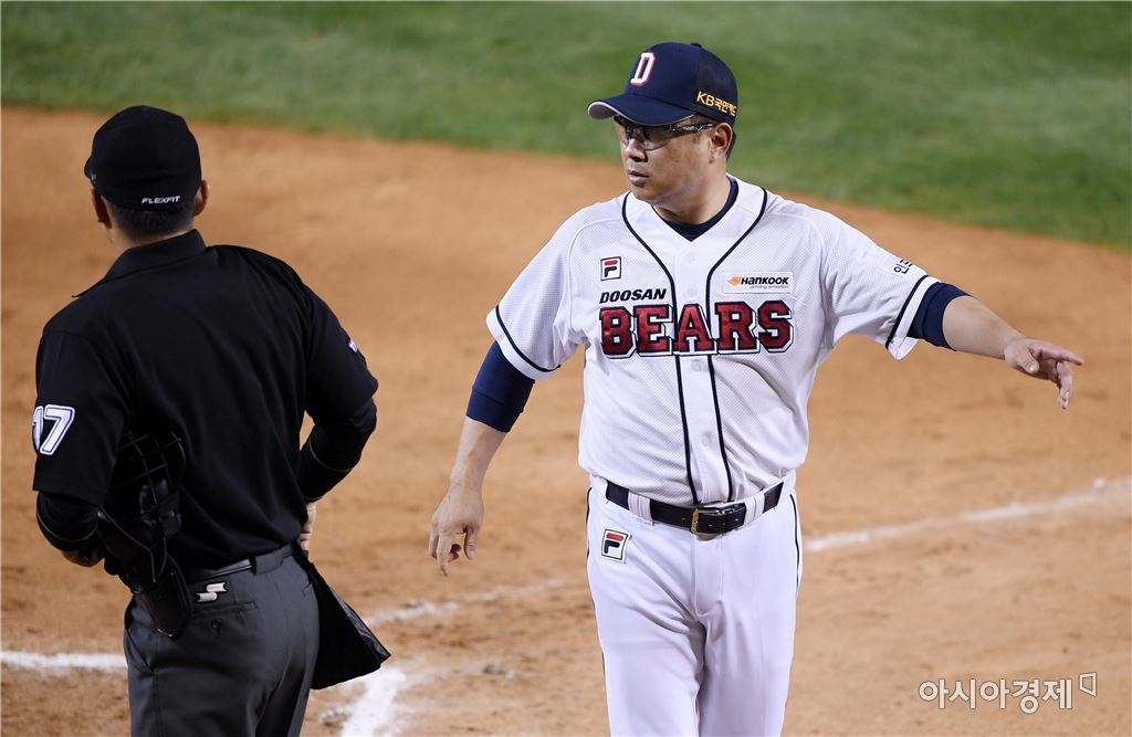 [아시아경제 김현민 기자]프로야구 SK 와이번스와 두산 베어스의 2017 KBO리그 경기가 28일 잠실구장에서 열렸다. 두산 김태형 감독이 8회초 1사 3루에서 두산 김강률의 폭투 때 SK 김강률의 사구를 주장하며 비디오판독을 요구하고 있다. 김현민 기자 kimhyun81@asiae.co.kr<ⓒ세계를 보는 창 경제를 보는 눈, 아시아경제(www.asiae.co.kr) 무단전재 배포금지>
