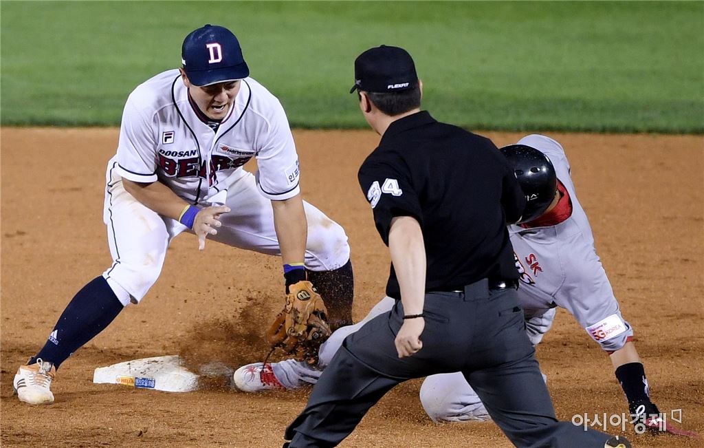 [아시아경제 김현민 기자]프로야구 SK 와이번스와 두산 베어스의 2017 KBO리그 경기가 28일 잠실구장에서 열렸다. 8회초 1사 1루에서 두산 2루수 최주환이 SK 이재원 타석 때 도루를 시도한 1루주자 김강민을 태그하고 있다. 비디오판독 결과 아웃.김현민 기자 kimhyun81@asiae.co.kr<ⓒ세계를 보는 창 경제를 보는 눈, 아시아경제(www.asiae.co.kr) 무단전재 배포금지>