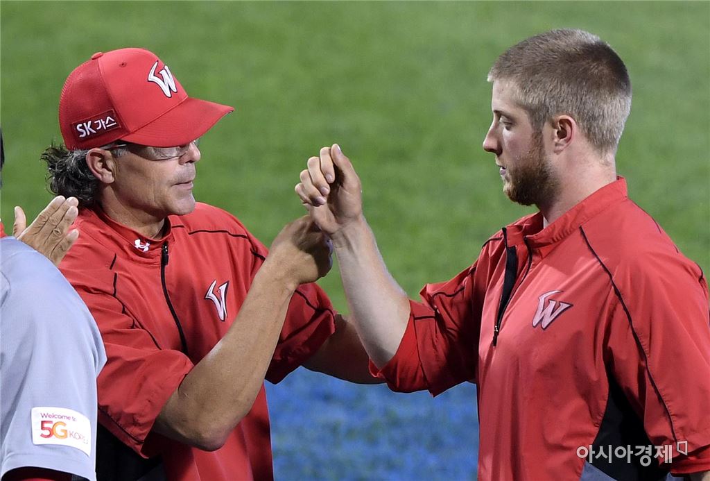 [아시아경제 김현민 기자]프로야구 SK 와이번스와 두산 베어스의 2017 KBO리그 경기가 28일 잠실구장에서 열렸다. SK 힐만 감독이 3-0 승리를 확정한 뒤 선발투수 켈리와 하이파이브하고 있다. 켈리는 7이닝 무실점 호투로 시즌 10승을 챙겼다. 김현민 기자 kimhyun81@asiae.co.kr<ⓒ세계를 보는 창 경제를 보는 눈, 아시아경제(www.asiae.co.kr) 무단전재 배포금지>