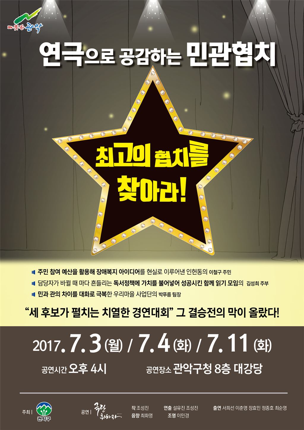 관악구청 8층 대강당에서 오후 4시부터 1시간동안 공연, 별도의 사전신청 없이 관심 있는 구민 누구나 관람할 수 있다. 관람료는 무료다.공연내용은 민관협치 우수사례 경연대회 결승전에 참가한 세 후보가 자신의 사례를 발표하며 경연을 펼치는 이야기다.주민참여예산을 활용해 장애인복지 아이디어를 현실로 이루어낸 사례 등 세 후보의 에피소드를 통해 관객에게 민관협치 가치와 중요성에 대한 메시지를 전달한다.특히 연극 속 경연내용에 대한 관객의 심사평을 듣고, 즉석 인터뷰를 진행하는 등 참여형 연극으로 진행된다.구는 이번 공연으로 관악구 직원과 구민이 한 자리에 모여 편안하게 소통하는 자리는 물론 지역 청년문화예술 활성화와 협치문화 확산 등 1석 3조의 효과를 거두겠다는 포부다. 유종필 구청장은 “연극을 통해 구민과 관악구 직원들이 협치를 쉽고 재미있게 이해, 서로 소통할 수 있는 시간이 되길 바란다”며 “관악구의 민관협치가 더욱 활성화 되도록 노력하겠다”고 말했다. 기획예산과(☎879-5582)박종일 기자 dream@asiae.co.kr<ⓒ세계를 보는 창 경제를 보는 눈, 아시아경제(www.asiae.co.kr) 무단전재 배포금지>