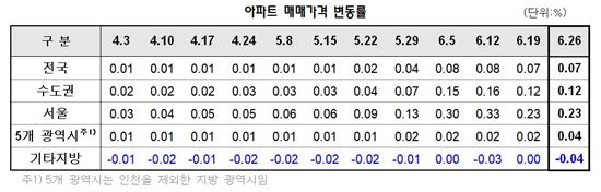 [아시아경제 박민규 기자] 6·19 부동산 대책 시행에도 불구하고 서울 아파트 가격 상승세는 여전한 것으로 나타났다.29일 KB국민은행 주택시장동향에 따르면 서울 아파트 매매가격 변동률은 지난 26일 기준으로 일주일 전보다 0.23% 올랐다. 전주인 19일 기준 상승률과 동일했다.서울의 아파트 가격 상승률은 6·19 부동산 대책이 시행되기 전인 12일 기준 0.33%에서 시행일인 19일 기준 0.23%로 둔화되긴 했지만 시행 이후 일주일이 지난 시점인 26일 기준으로는 변화가 없었다.서울 강남 지역은 26일 기준 0.22% 올랐고 강북도 0.24% 상승했다. 일주일 전인 지난 19일 기준 상승률(강북 0.24%, 강남 0.23%)과 거의 동일했다. 강남 3구(강남·서초·송파)는 송파구를 제외하고 상승률이 가팔라졌다. 강남구는 지난 12일 기준 0.15%에서 19일 기준 0.11%로 내려갔다가 26일 기준 0.24%로 다시 뛰었다. 서초구는 같은 기간 0.06%, 0.20%, 0.23%로 오름세를 이어갔다. 다만 송파구는 0.11%, 0.09%, 0.08%로 하락세를 보였다.황재현 국민은행 부동산정보팀장은 “강남 3구는 정부의 6·19 부동산 대책 발표로 저가 매물 위주로 문의는 계속되고 있으나 매매 및 투자 수요는 낮아졌다”고 설명했다.수도권과 전국 기준으로 살펴봐도 아파트 가격 상승세를 꺾이지 않았다. 수도권 아파트 가격 상승률은 지난 12일 기준 0.16%에서 19일 기준 0.12%로 내렸지만 26일 기준으로 0.12%를 기록해 상승세를 이어갔다. 전국의 경우 12일 기준 0.08%, 19일 기준 0.07%, 26일 기준 0.07%를 나타내 거의 변화가 없었다.박민규 기자 yushin@asiae.co.kr<ⓒ세계를 보는 창 경제를 보는 눈, 아시아경제(www.asiae.co.kr) 무단전재 배포금지>