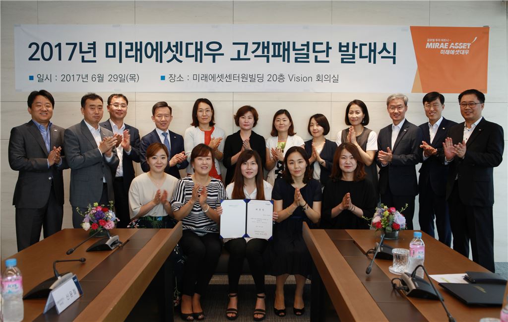 [아시아경제 박철응 기자]미래에셋대우는 29일 ‘미래에셋대우 고객패널‘ 제1기 발대식을 개최하고 10명의 고객패널을 임명했다고 밝혔다.이들은 7월부터 10월까지 4개월동안 신상품 기획 시 의견 제시, 기존 상품의 서비스와 제도에 대한 개선사항 등을 제안하는 활동을 한다. 발대식에 참석한 최현만 수석부회장은 “고객을 위하는 상품을 만들고 더 나은 서비스를 제공하기 위해 고객 패널분들의 생생한 현장의 목소리를 적극 반영하겠다”며 “금융소비자보호와 고객동맹을 위한 다양한 노력을 지속해 나가겠다”고 말했다.미래에셋대우는 오프라인 고객패널 제도 외에도 ‘온라인 고객패널’과 ‘명예지점장 고객 제도’를 운영 중이며 앞으로도 각각의 활동을 통해 고객과의 소통 창구로 적극 활용할 예정이다.