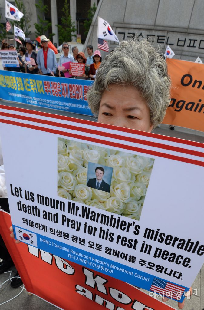 [아시아경제 문호남 수습기자] 태극기혁명국민운동본부 등 보수단체 회원들이 29일 서울 종로구 광화문광장 세종대왕상 앞에서 북한에 장기간 억류됐다가 의식불명 상태로 송환됐지만 엿새 만에 숨진 미국 대학생, 오토 웜비어 추모 기자회견을 열고 있다.문호남 수습기자 munonam@asiae.co.kr<ⓒ세계를 보는 창 경제를 보는 눈, 아시아경제(www.asiae.co.kr) 무단전재 배포금지>