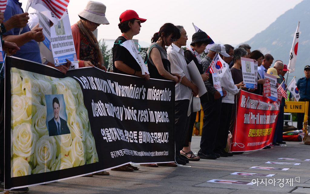 [아시아경제 문호남 수습기자] 태극기혁명국민운동본부 등 보수단체 회원들이 29일 서울 종로구 광화문광장 세종대왕상 앞에서 북한에 장기간 억류됐다가 의식불명 상태로 송환됐지만 엿새 만에 숨진 미국 대학생, 오토 웜비어 추모 기자회견을 열고 있다.문호남 수습기자 munonam@asiae.co.kr<ⓒ세계를 보는 창 경제를 보는 눈, 아시아경제(www.asiae.co.kr) 무단전재 배포금지>