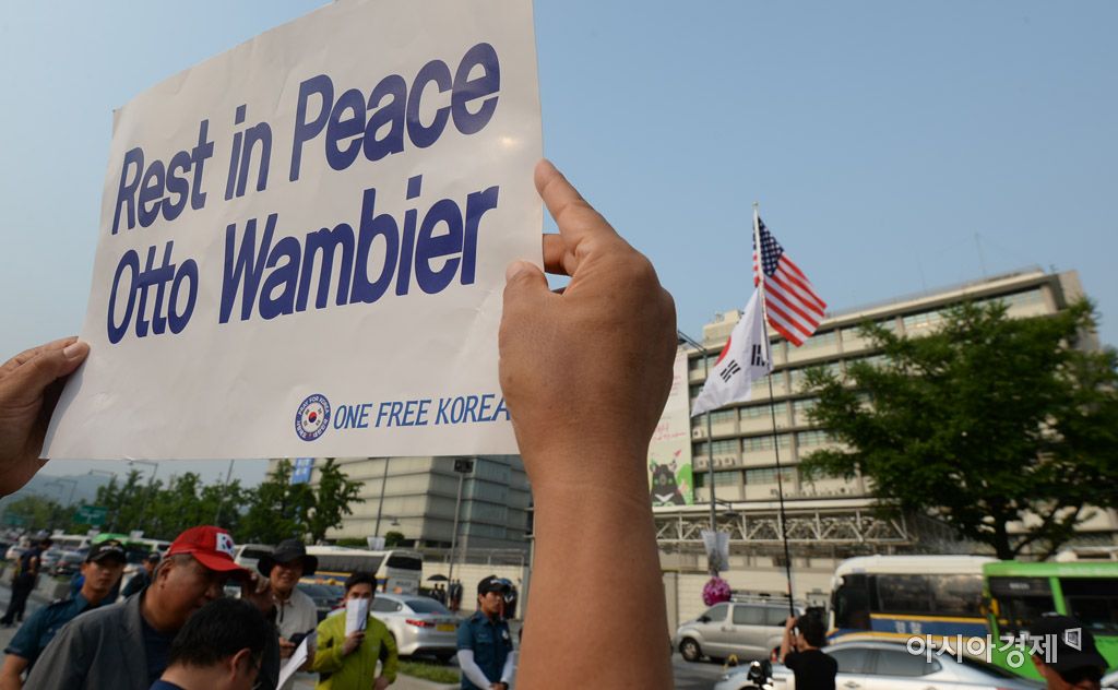 [아시아경제 문호남 수습기자] 태극기혁명국민운동본부 등 보수단체 회원들이 29일 서울 종로구 광화문광장 세종대왕상 앞에서 북한에 장기간 억류됐다가 의식불명 상태로 송환됐지만 엿새 만에 숨진 미국 대학생, 오토 웜비어 추모 기자회견을 열고 있다.문호남 수습기자 munonam@asiae.co.kr<ⓒ세계를 보는 창 경제를 보는 눈, 아시아경제(www.asiae.co.kr) 무단전재 배포금지>