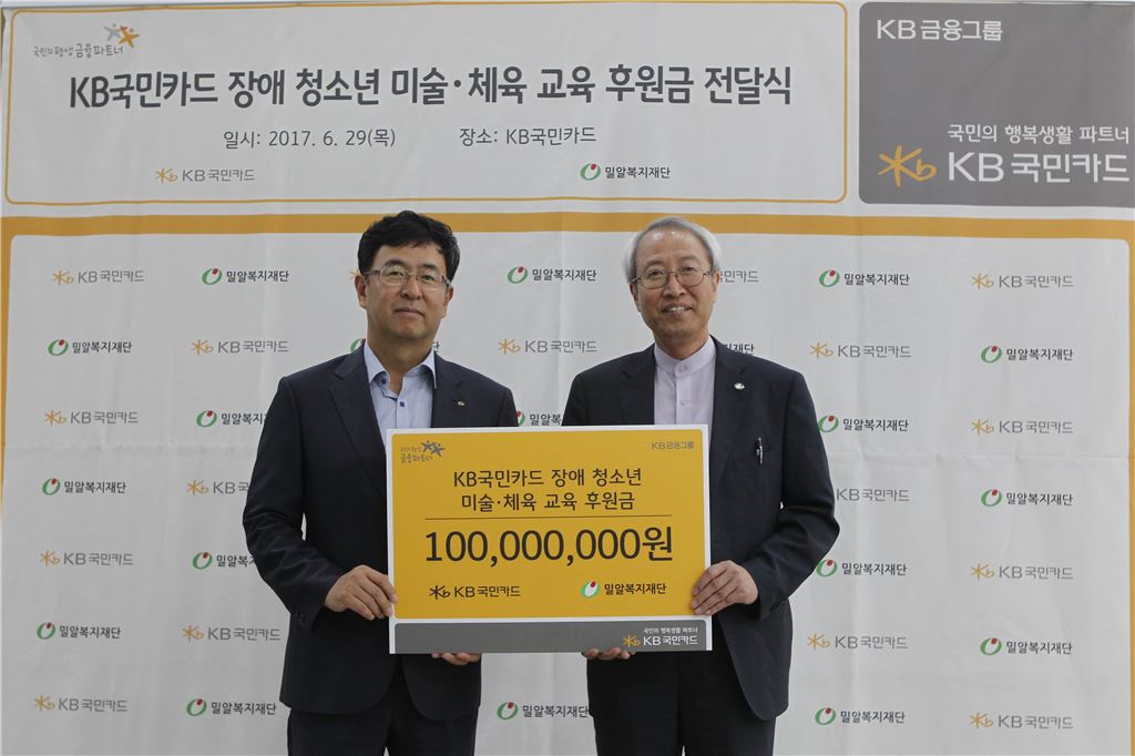 29일 서울 종로구 KB국민카드 본사에서 (왼쪽부터)백문일 KB국민카드 브랜드전략부 상무가 정형석 밀알복지재단 상임대표에게 장애 청소년의 미술·체육 활동 지원을 위한 후원금 1억원을 전달하고 있다. (사진 : KB국민카드)