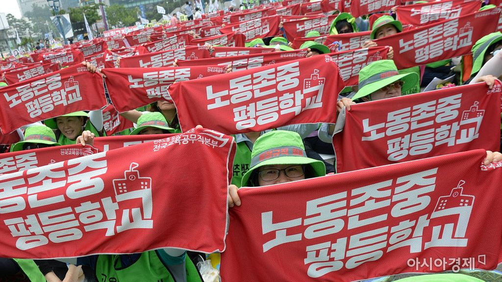 [아시아경제 문호남 수습기자] 민주노총 공공운수노조 전국교육공무직본부 관계자들이 30일 서울역 광장에서 열린 '세상을 바꾸는 학교 비정규직 6·30 총파업 대회'에서 비정규직 없는 노동존중 평등학교를 촉구하며 구호를 외치고 있다.문호남 수습기자 munonam@asiae.co.kr<ⓒ세계를 보는 창 경제를 보는 눈, 아시아경제(www.asiae.co.kr) 무단전재 배포금지>