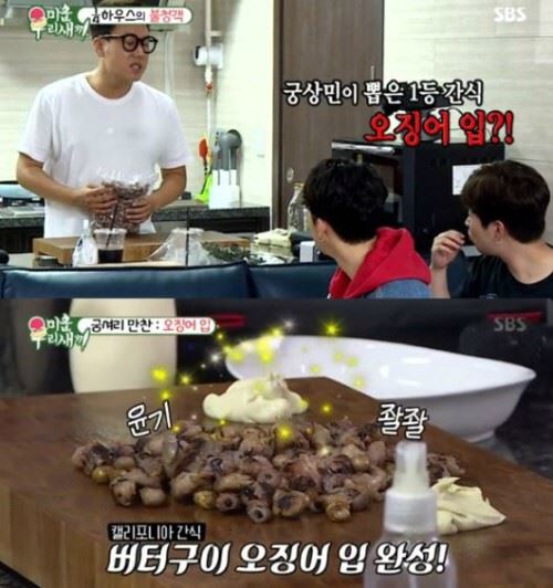 '미운우리새끼'이상민이 공개한 '오징어 입'이 화제를 모으고 있다.지난 2일 방송한 SBS '미운우리새끼'에서는 이상민이 딘딘과 슬리피를 위해 오징어 입 버터구이를 만드는 모습이 전파를 탔다.이날 이상민은 후배들을 위해 냉장고에서 오징어 입을 꺼냈다. 그는 "건어물 중에 제일 맛있고 제일 싼 부위가 바로 이 오징어 입이다. 먹어보면 알 거다. 그 위대함을"이라고 말했다.이상민은 버터에 오징어입, 은행을 볶아서 내놓았다. 마요네즈 고추냉이 소스까지 함께 곁들여 슬리피와 딘딘을 놀라게 했다. 특히 오징어 입 버터구이를 맛본 딘딘은 "진짜 맛있다. 은행 때문인가?"라고 감탄 해 눈길을 사로잡았다.미디어이슈팀 기자 <ⓒ세계를 보는 창 경제를 보는 눈, 아시아경제(www.asiae.co.kr) 무단전재 배포금지>